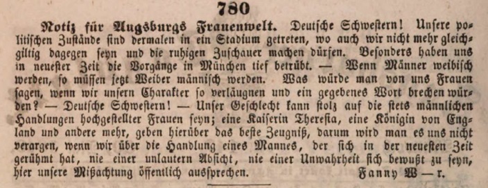 „Notiz für Augsburgs Frauenwelt. Deutsche Schwestern! Unsere politischen Zustände sind dermalen in ein Stadium getreten, wo auch wir nicht mehr gleichgiltig dagegen seyn und die ruhigen Zuschauer machen dürfen. Besonders haben uns in neuester Zeit die Vorgänge in München [Barrikadenkämpfe, Lola-Montez-Skandal] tief betrübt. – Wenn Männer weibisch werden, so müssen jetzt Weiber männisch werden. Was würde man von uns Frauen sagen, wenn wir unsern Charakter so verläugnen und ein gegebenes Wort brechen würden? – Deutsche Schwestern! – Unser Geschlecht kann stolz auf die stets männlichen Handlungen hochgestellter Frauen seyn; eine Kaiserin Theresia, eine Königin von England und andere mehr, geben hierüber das beste Zeugniß, darum wird man es uns nicht verargen, wenn wir über die Handlung eines Mannes, der sich in der neuesten Zeit gerühmt hat, nie einer unlautern Absicht, nie einer Unwahrheit sich bewußt zu seyn, hier unsere Mißachtung öffentlich aussprechen. Fanny W––r.“[22]